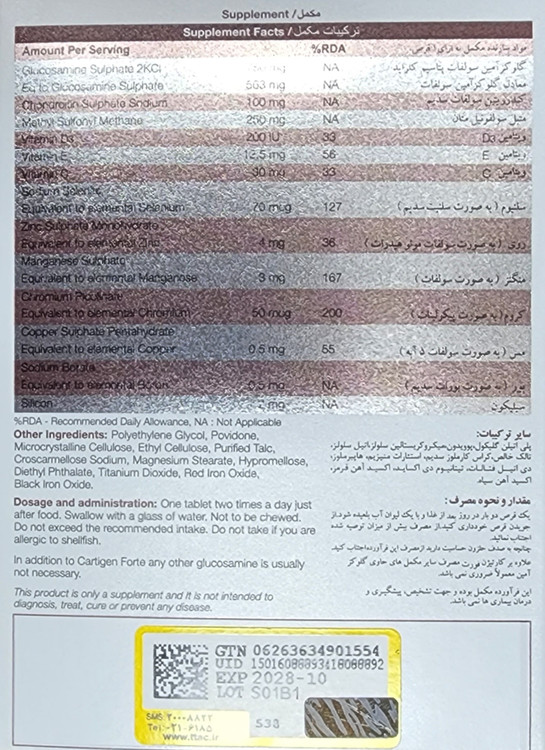کارتیژن فورت حاوی گلوکزآمین، کندرویتین، MSM، ویتامینها و مواد معدنی