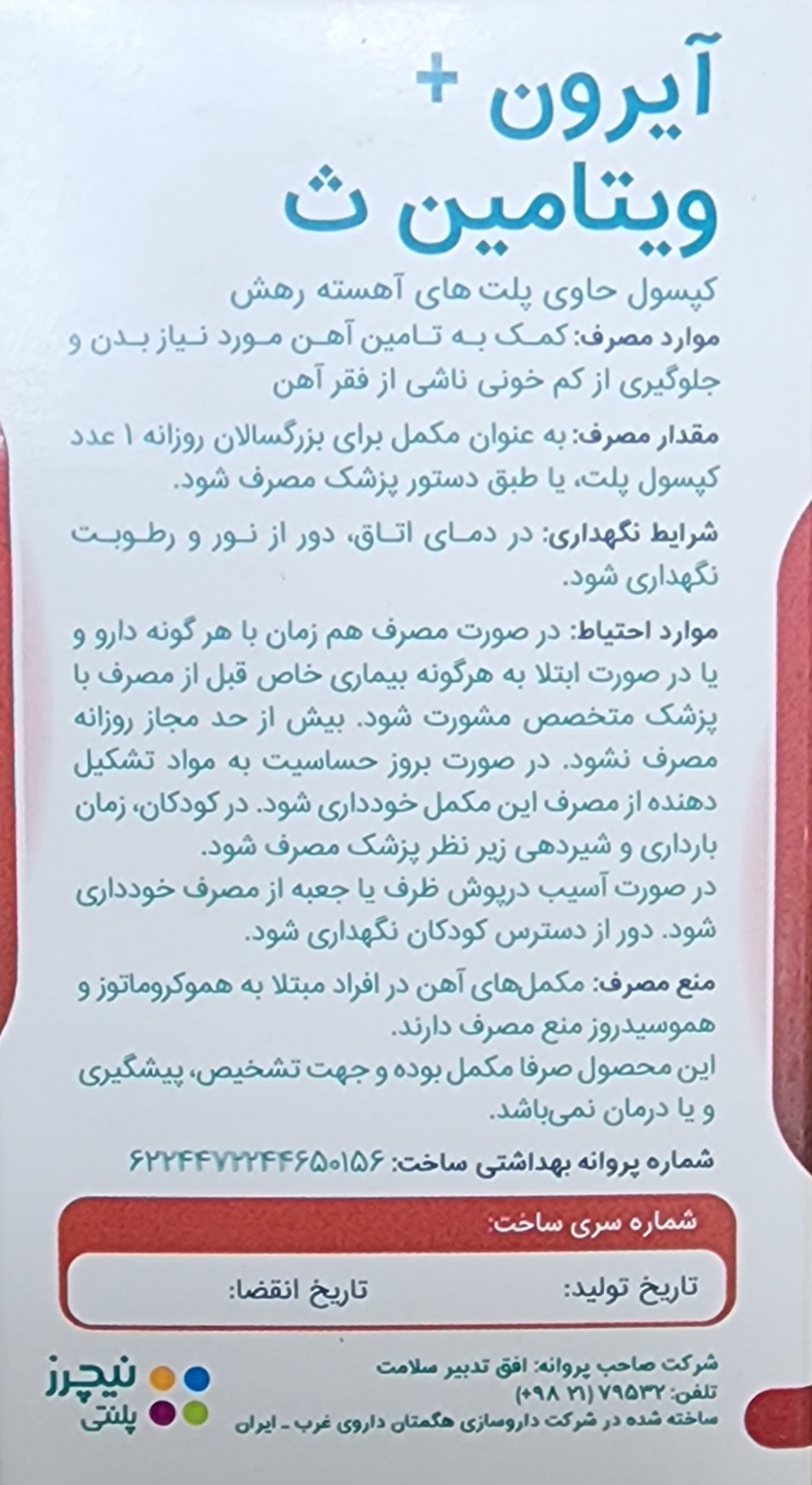 آیرون ویتامین ث نیچرز پلنتی، مکمل تغذیهای دارای آهن، ویتامین B9 ,B12 و C