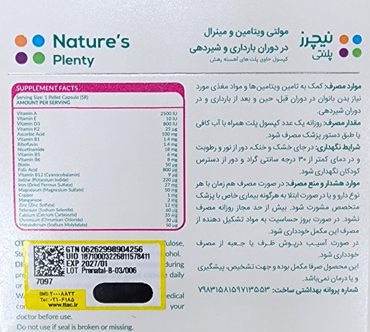 مولتی ویتامین و مینرال بارداری و شیردهی نیچرز پلنتی قابل استفاده از پیش از بارداری تا پایان شیردهی