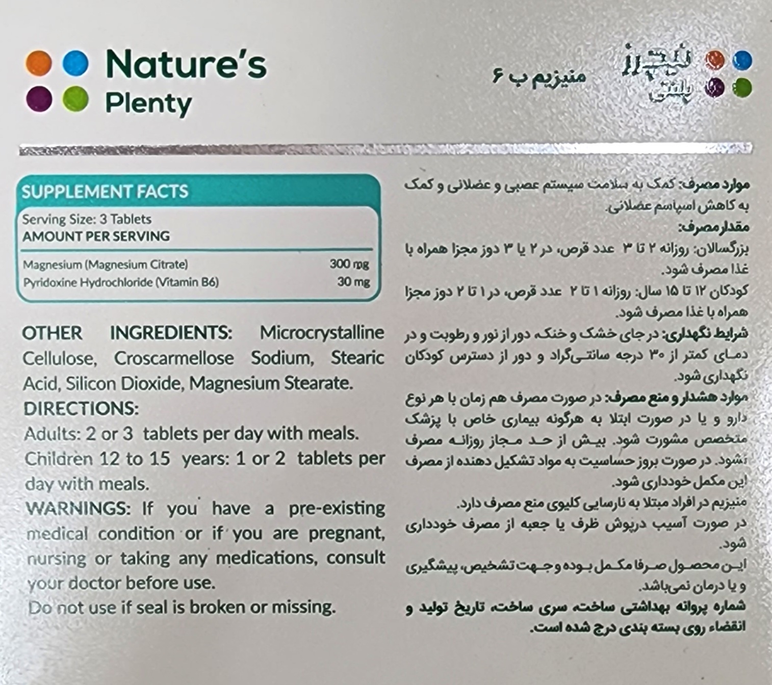 منیزیم ب6 نیچرز پلنتی، حاوی ترکیب منیزیم سیترات و ویتامین B6