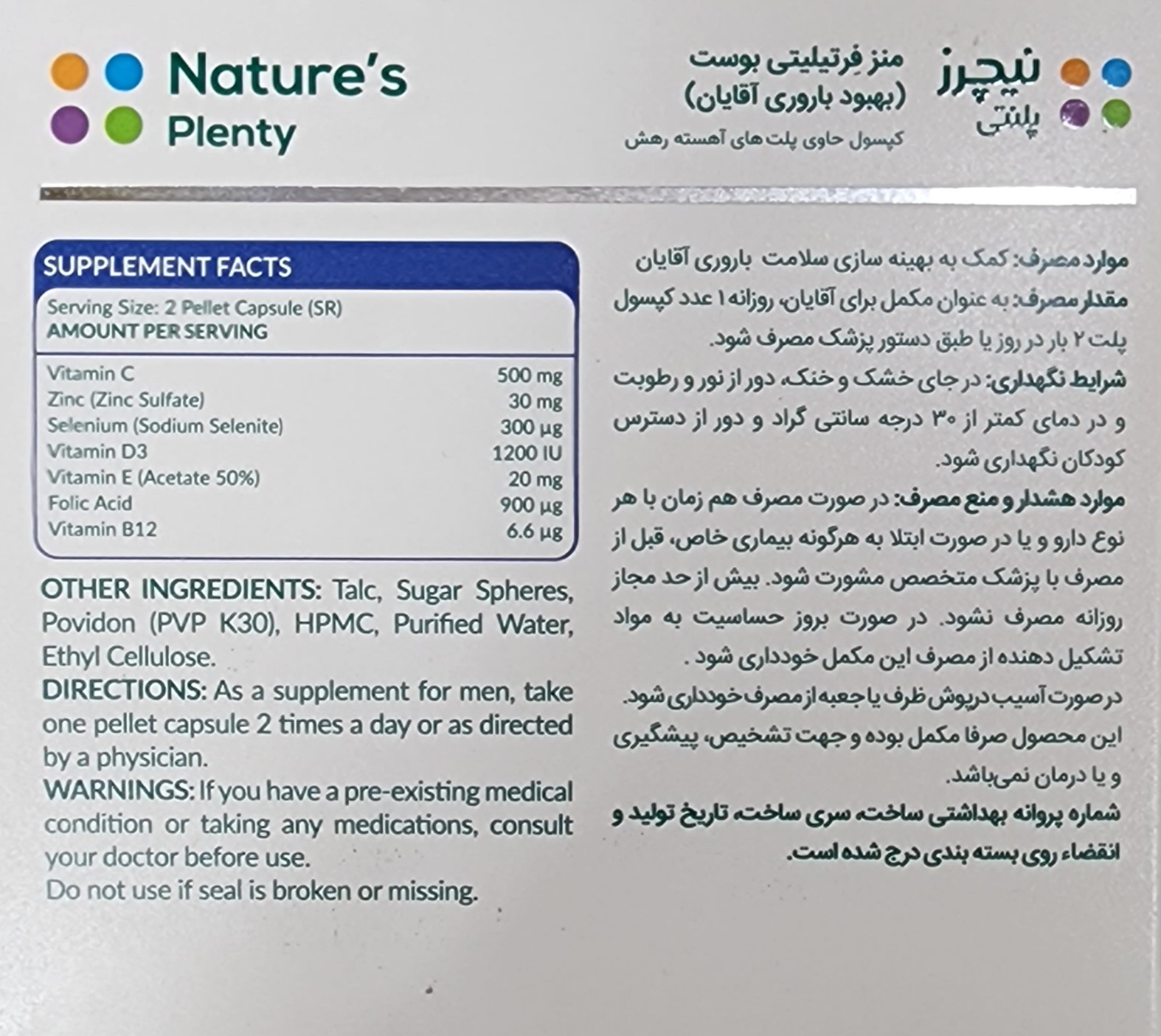 منز فرتیلیتی بوست نیچرز پلنتی، حاوی سلنیوم، زینک، ویتامین D3 ،E ،C ،B9 و B12