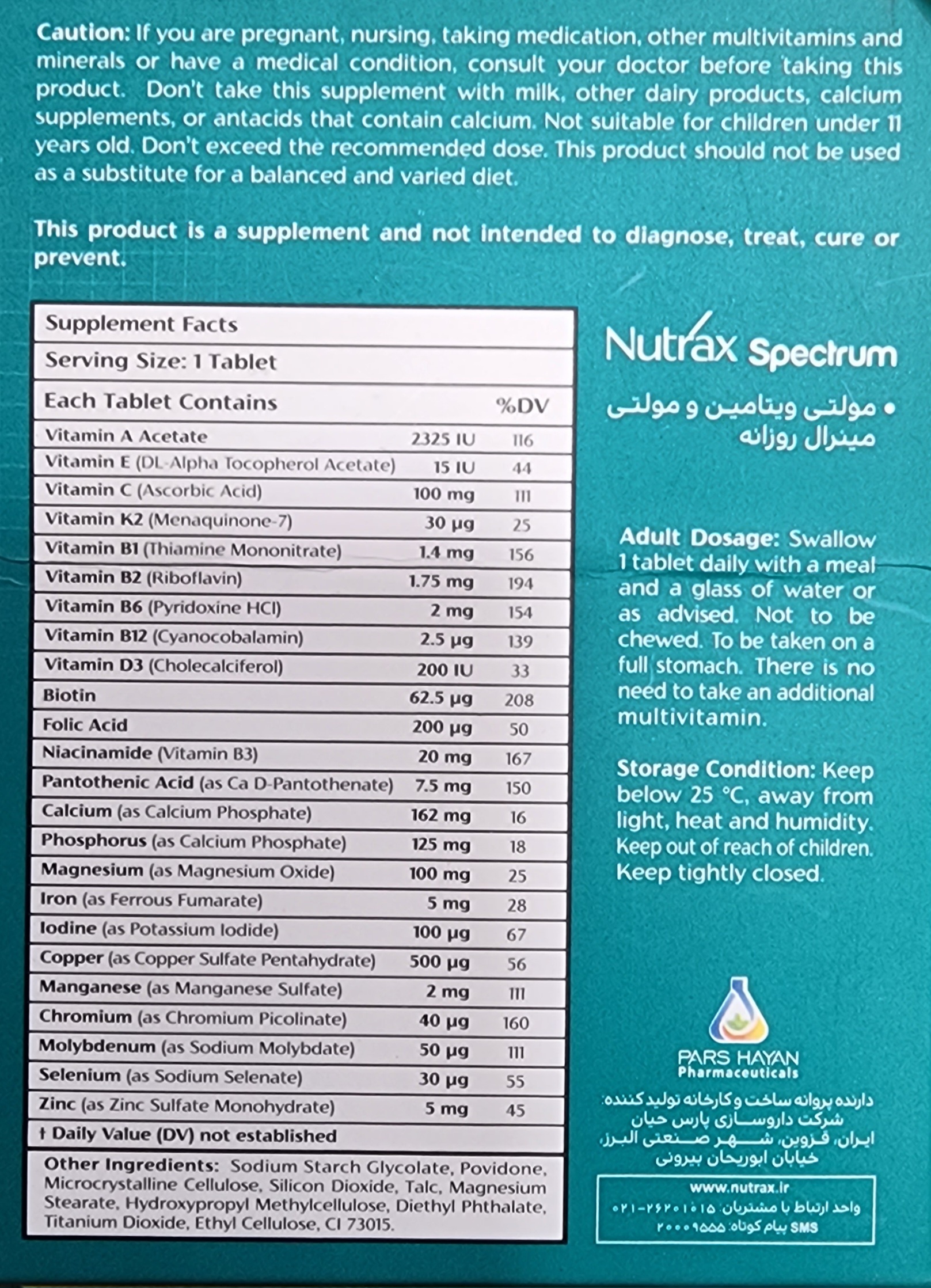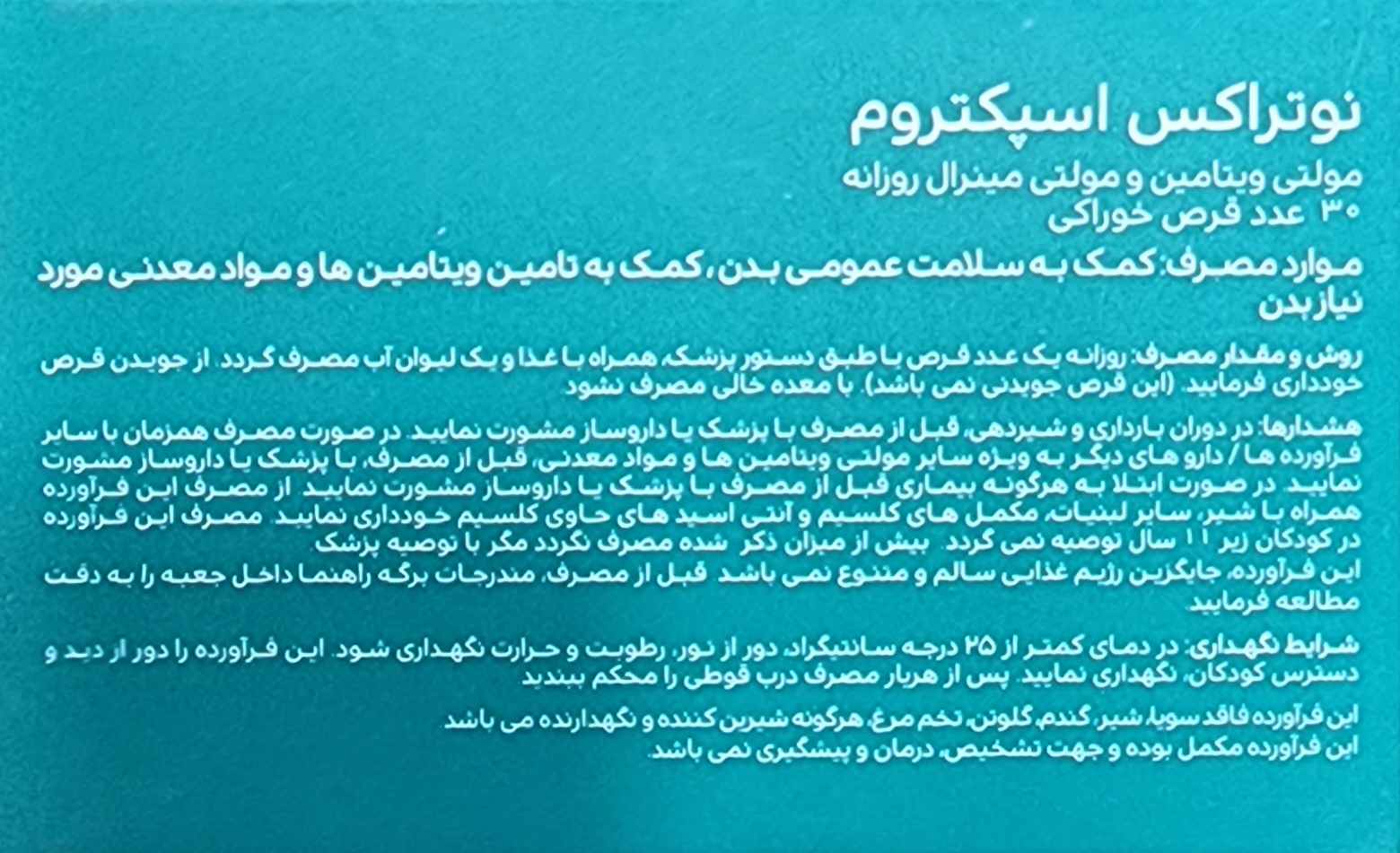 هر قوطی از قرص نوتراکس اسپکتروم مناسب استفاده به مدت 30 روز میباشد.