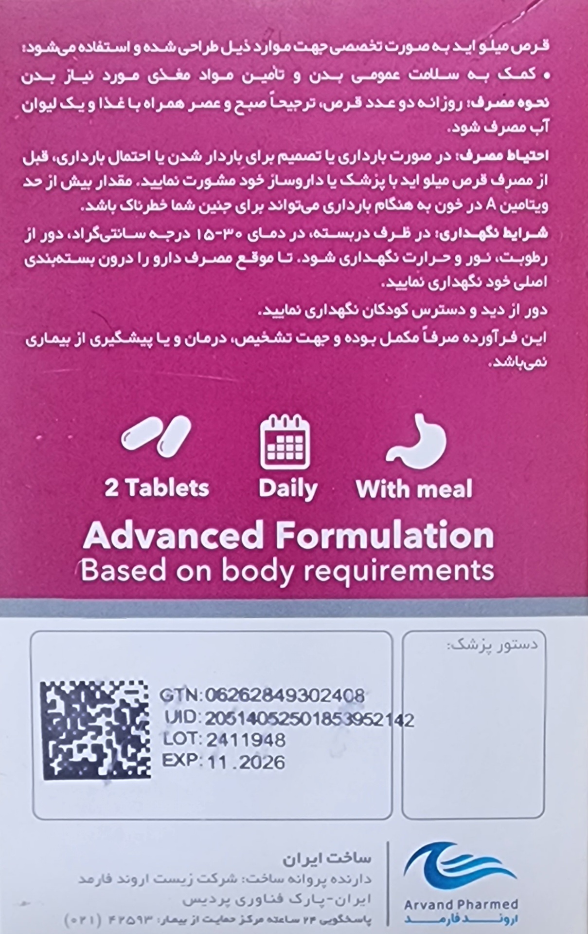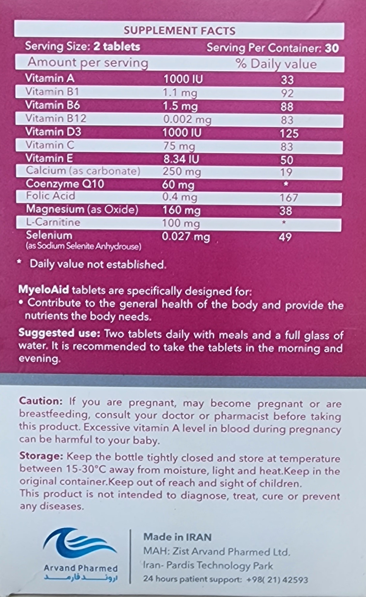 قرص میلواید تامین کننده ویتامین ها و مواد معدنی مورد نیاز افراد به ویژه مبتلایان به بیماری ام اس تامین ویتامین های A، C، D3 و گروه B برای حفظ سلامت عمومی بدن تامین کلسیم، منیزیم و سلنیوم برای حفظ سلامت استخوان حاوی کیوتن و ال کارنیتین برای افزایش انرژی و احساس شادابی مناسب خانم ها و آقایان دوز مصرف میلواید: روزانه 2 عدد قرص هر قوطی قرص میلواید مناسب استفاده به مدت 30 روز می باشد.