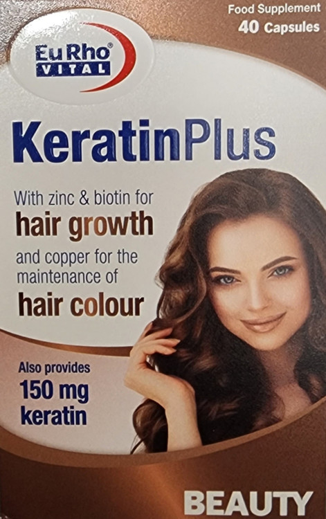 کراتین پلاس یوروویتال حاوی کراتین، روی، بیوتین، مس، فولیک اسید، ویتامین B12 و ویتامین D