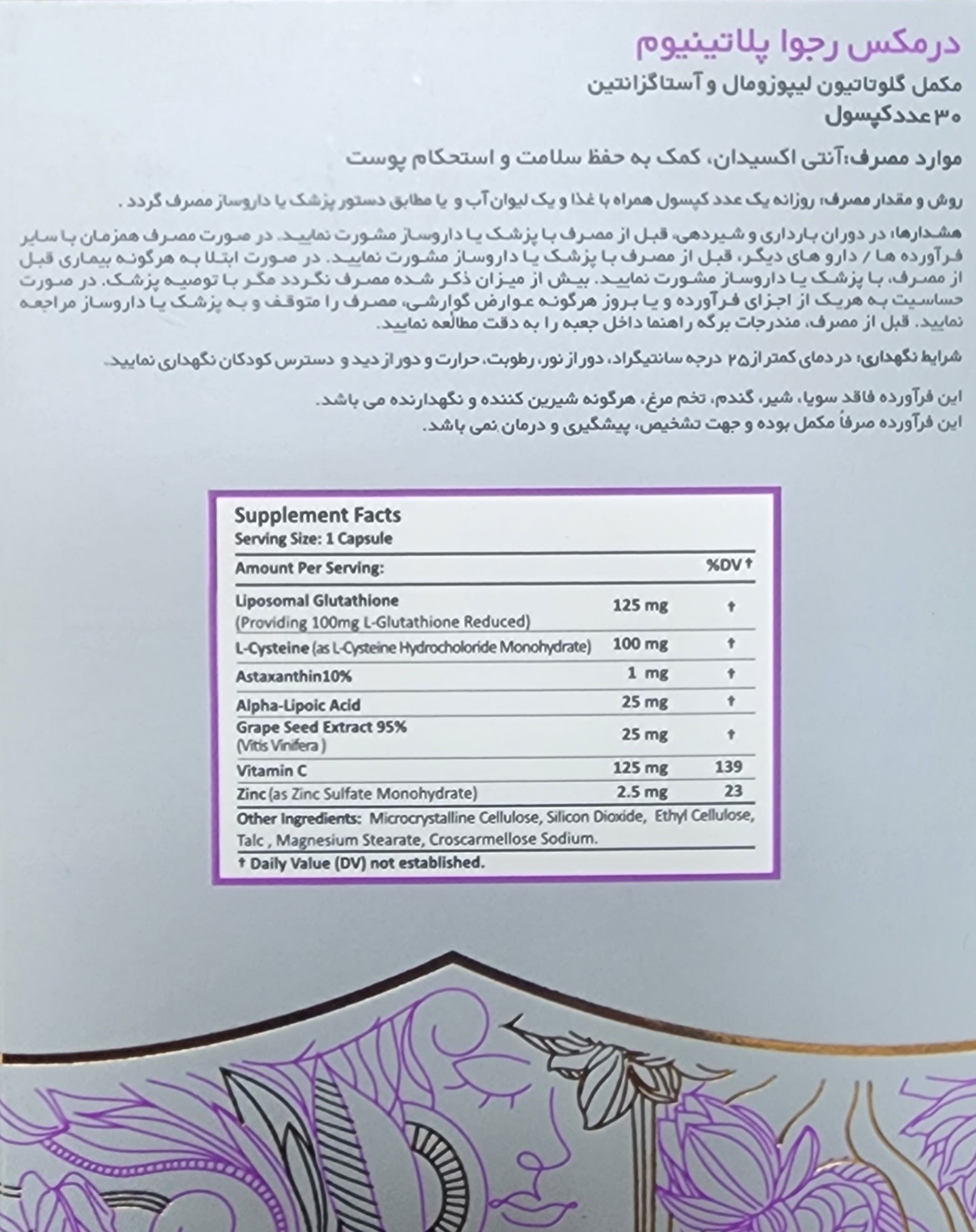 حاوی ترکیباتی همچون گلوتاتیون لیپوزومال، عصاره هسته انگور و آلفا لیپوئیک اسید