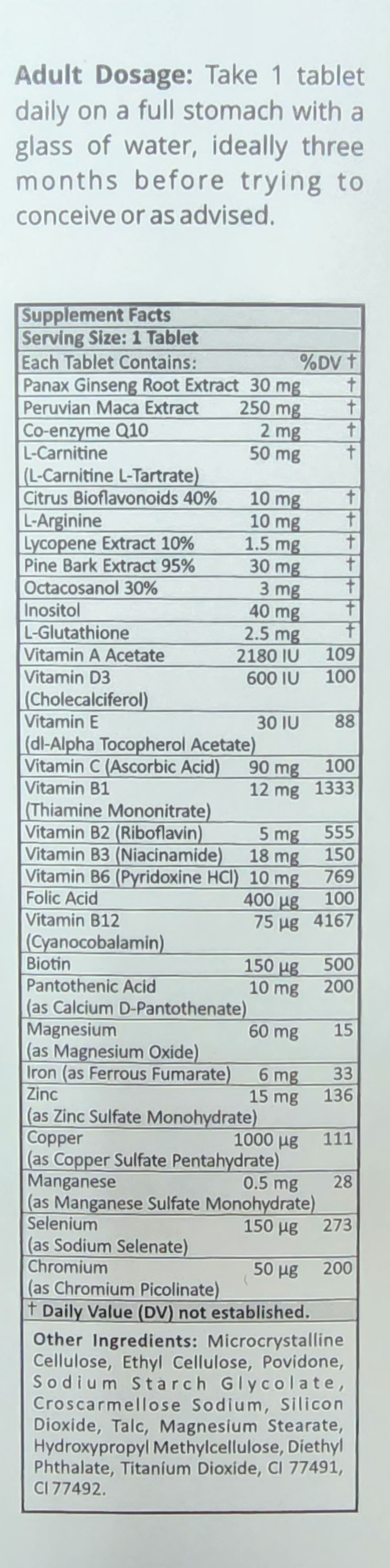 - ال کارنیتین L-Carnitine ( as L-Carnitine L-tartrate ): اسیدآمینهای است که دارای عملکردهای زیادی در بدن است. از جمله مهمترین عملکرد آن برای مردان این است که با بهبود تحرک اسپرم، در کمک به درمان ناباروری در آقایان موثر است.