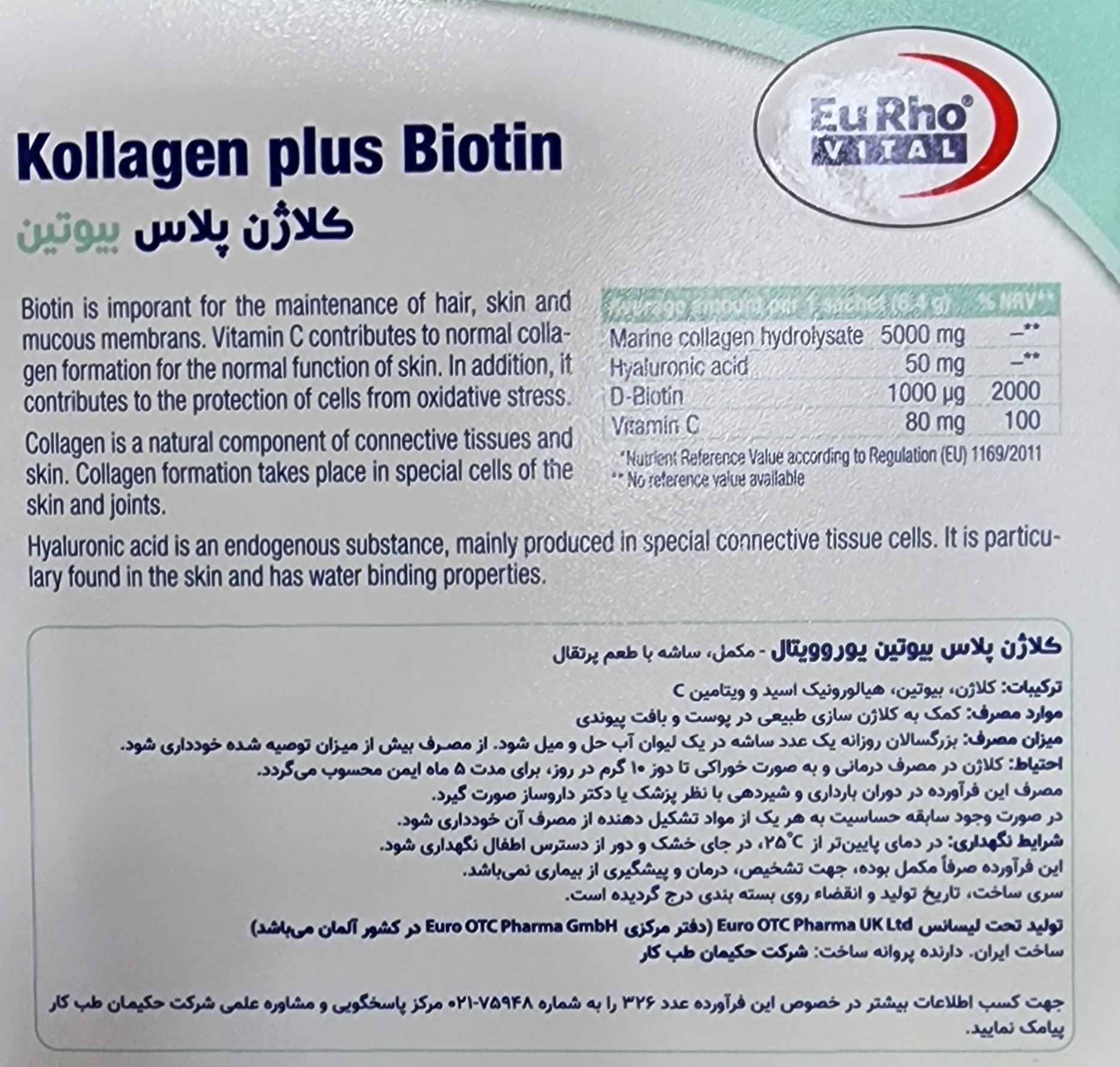 هر جعبه از کلاژن پلاس بیوتین یوروویتال دارای 14 ساشه 6.4 گرمی میباشد.