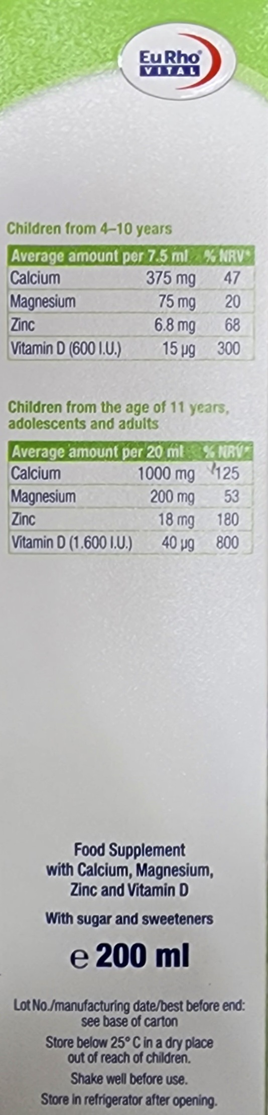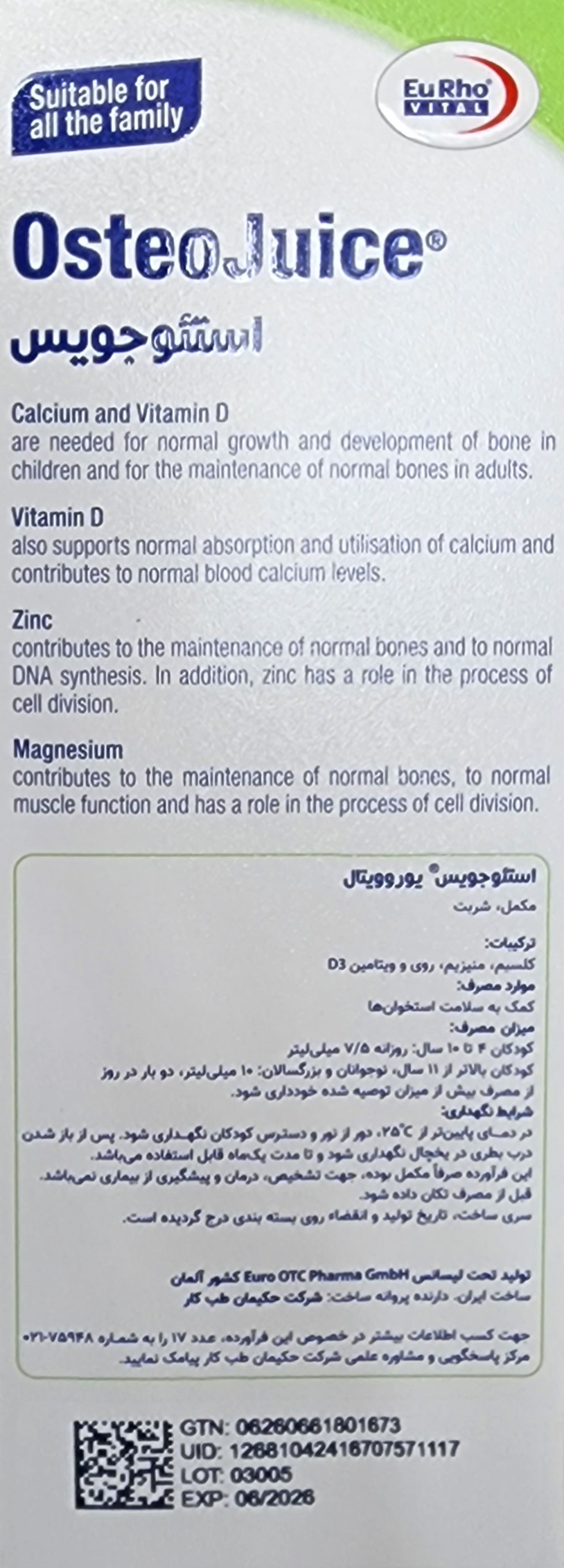 ترکیبات شربت استئوجویس یوروویتال: کلسیم، منیزیم، زینک (روی) و ویتامین D