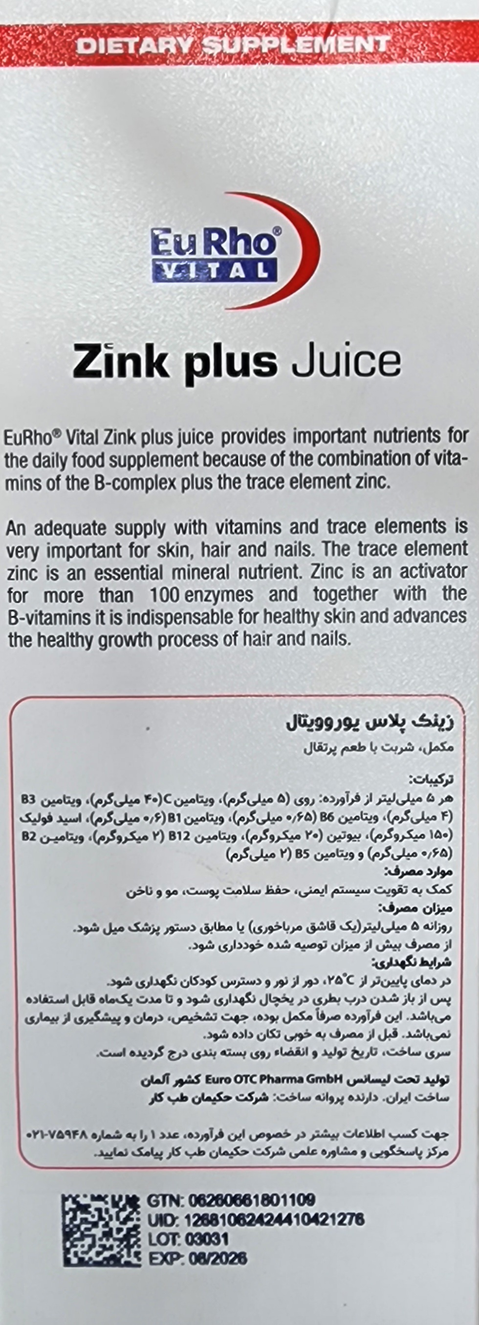شربت زینک پلاس جویس یوروویتال حاوی عنصر زینک به اضافه ویتامین c و ب کمپلکس است. شربت زینک پلاس جویس با تأمین ریز مغذی های مهم روزانه به حفظ سلامتی عمومی بدن و عملکرد طبیعی سیستم ایمنی کمک می کند و برای تقویت بافت پوست، مو و ناخن مفید می باشد. شربت زینک پلاس برای کودکان، نوجوانان و بزرگسالان قابل استفاده است.
