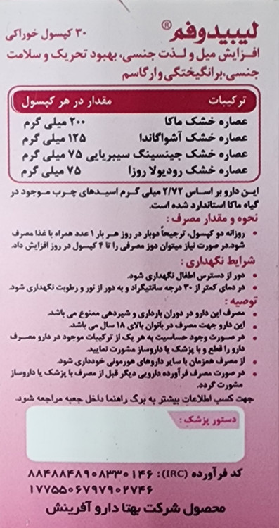 لیبیدوفم کپسول تقویت جنسی بانوان۳۰عددی۲۰۲۶/۱۰