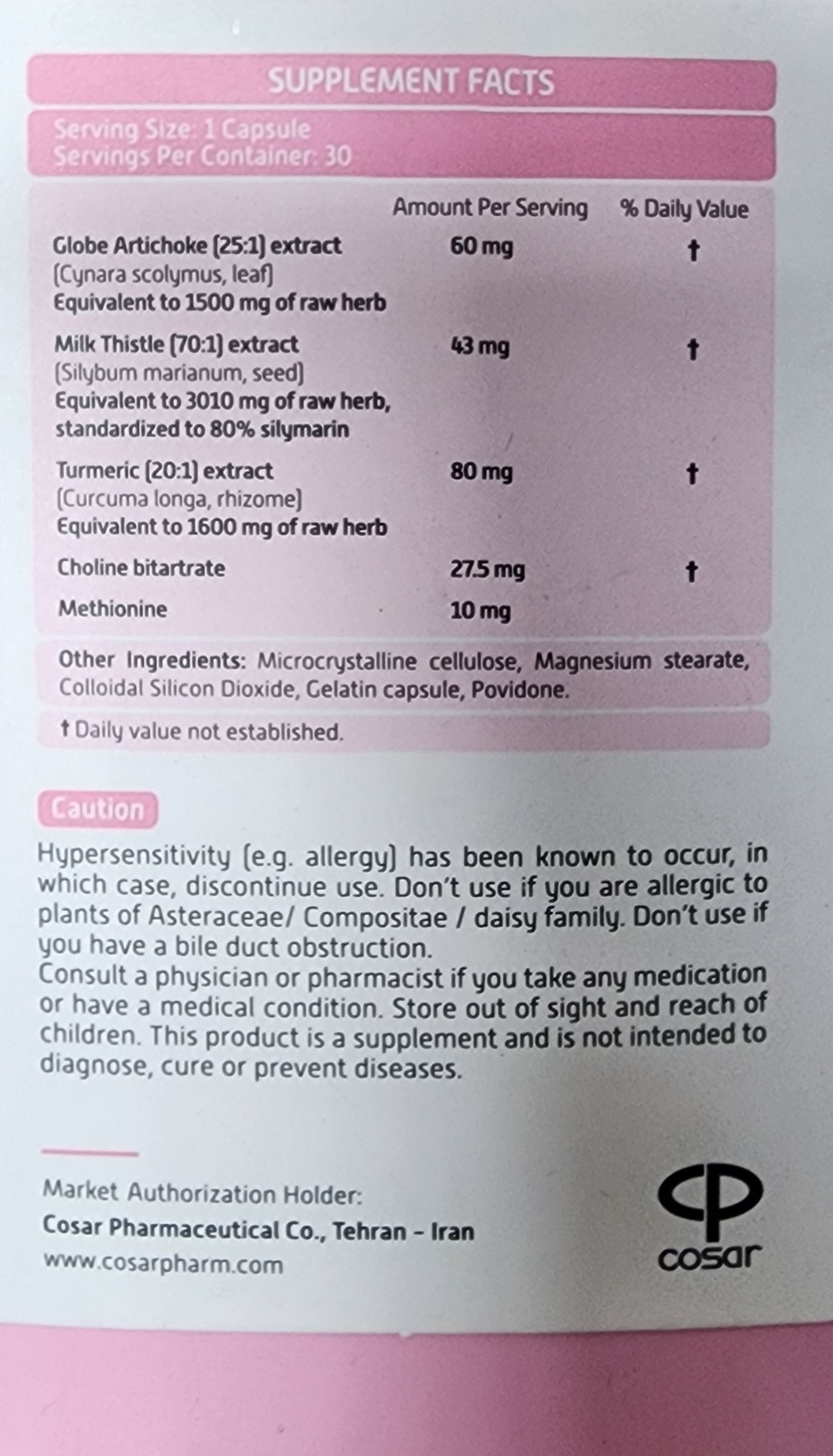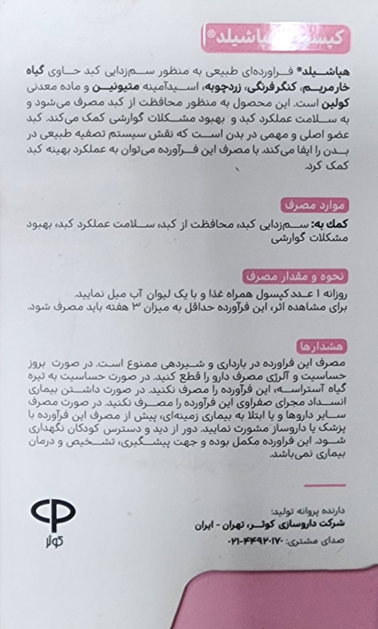 هپاشیلد، حاوی ترکیبات گیاهی از جمله گیاه خارمریم، زردچوبه، کنگر فرنگی، به همراه اسید آمینه متیونین و ماده معدنی کولین