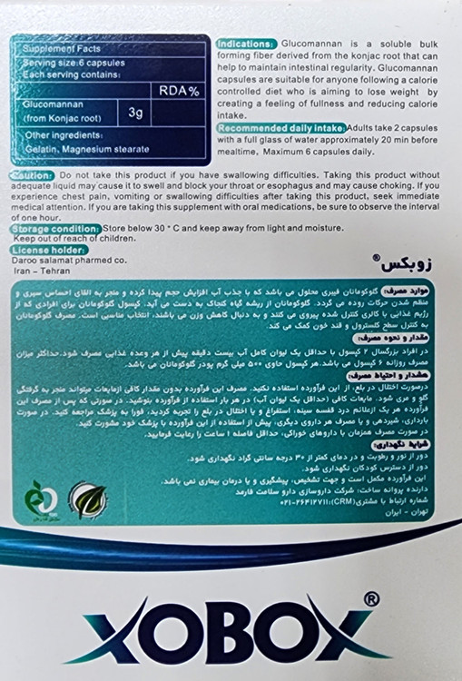 کپسول زوبوکس حاوی فیبر گلوکومانان (از ریشه کنجاک)