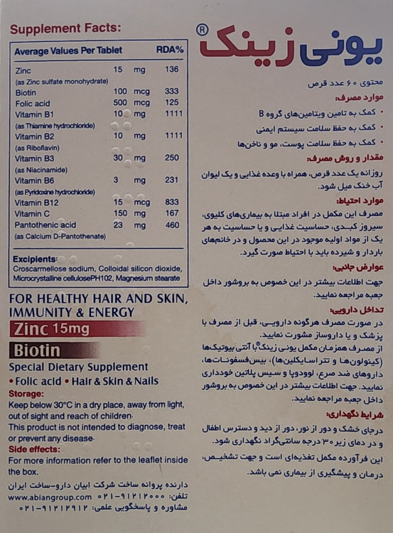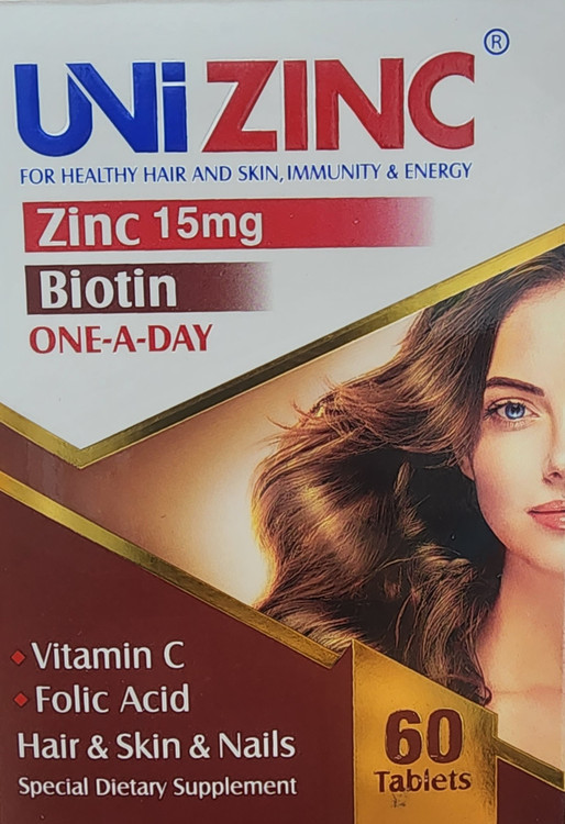 قرص یونی زینک مکملی کامل برای تقویت مو، پوست و ناخن است که با ترکیب مؤثر زینک، بیوتین، ویتامین B5، فولیک اسید و ویتامین C به کاهش ریزش مو، افزایش ضخامت تار مو، استحکام ناخنها و تقویت سیستم ایمنی کمک میکند. هر بسته حاوی دوز کافی برای 60 روز مصرف روزانه است.