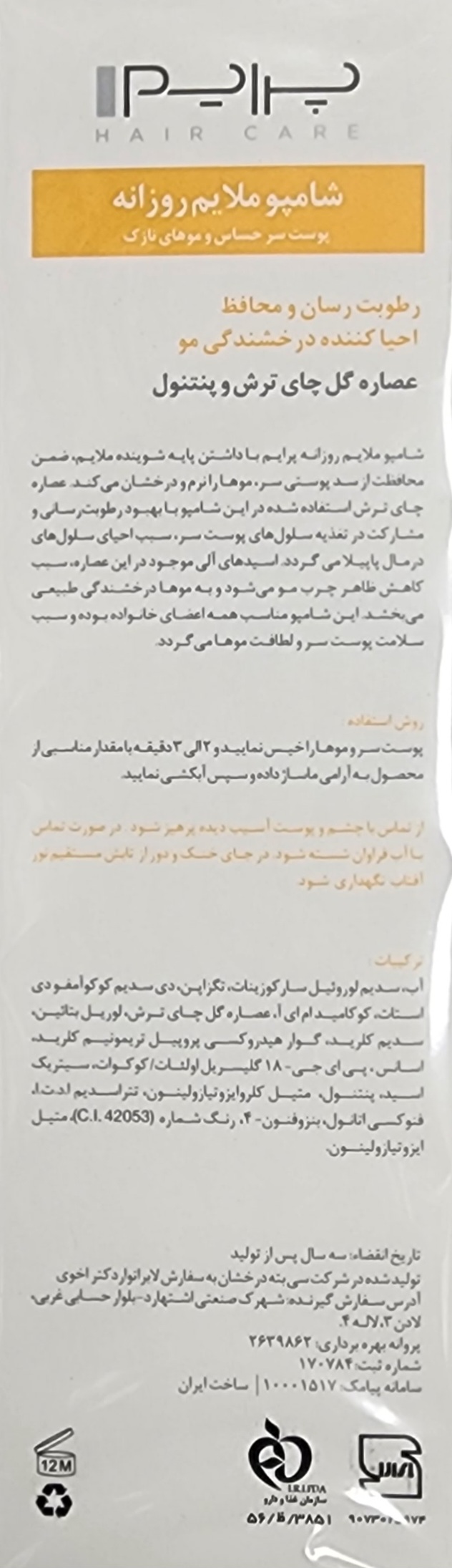 شامپو روزانه پریم، پاک کننده موثر و ایمن پوست سر حاوی سورفکتانت های طبیعی و اسید های ارگانیک