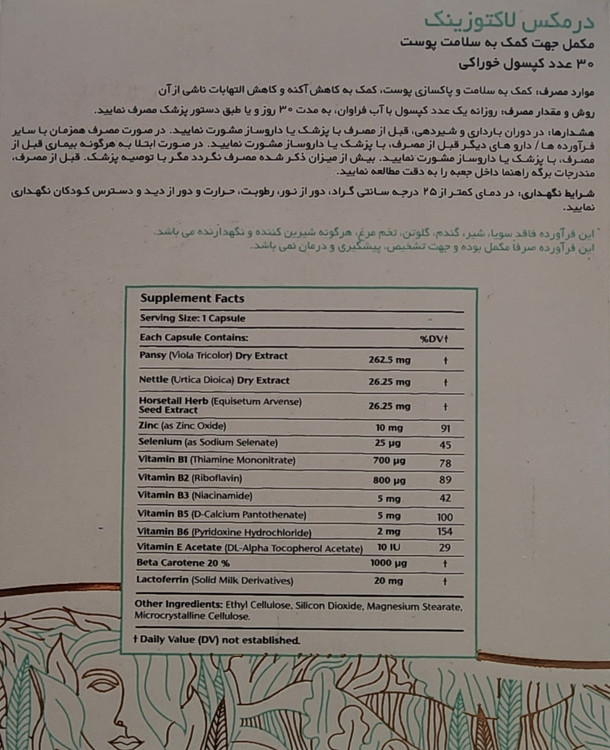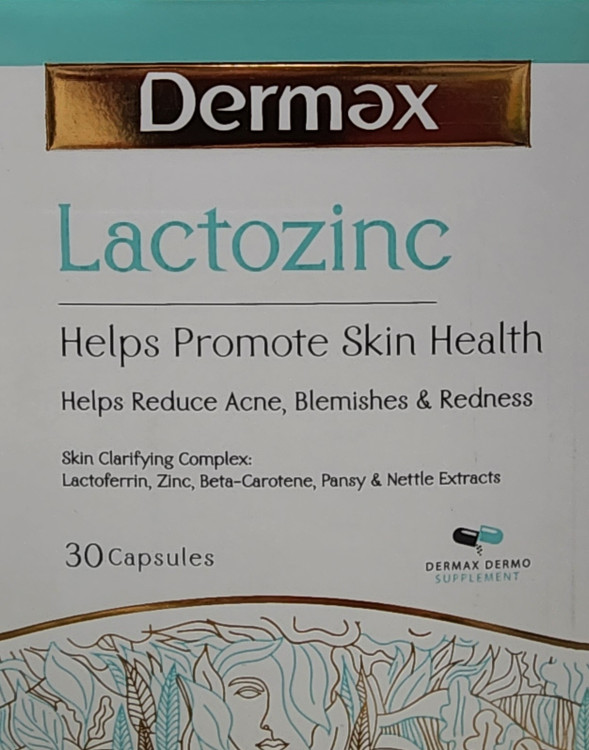کپسول لاکتوزینک، محصولی باکیفیت از برند درمکس بوده که با داشتن ترکیبات گیاهی و ویتامینهای لازم برای بدن به بهبود پوست، مو و ناخن میپردازد. مصرف مرتب این مکمل میتواند در کاهش آکنه و شفاف سازی پوست تاثیر بسیار زیادی داشته باشد. همچنین این محصول در کلاژن سازی پوست نیز موثر عمل میکند. بعد از نهار یک عدد مصرف شود.