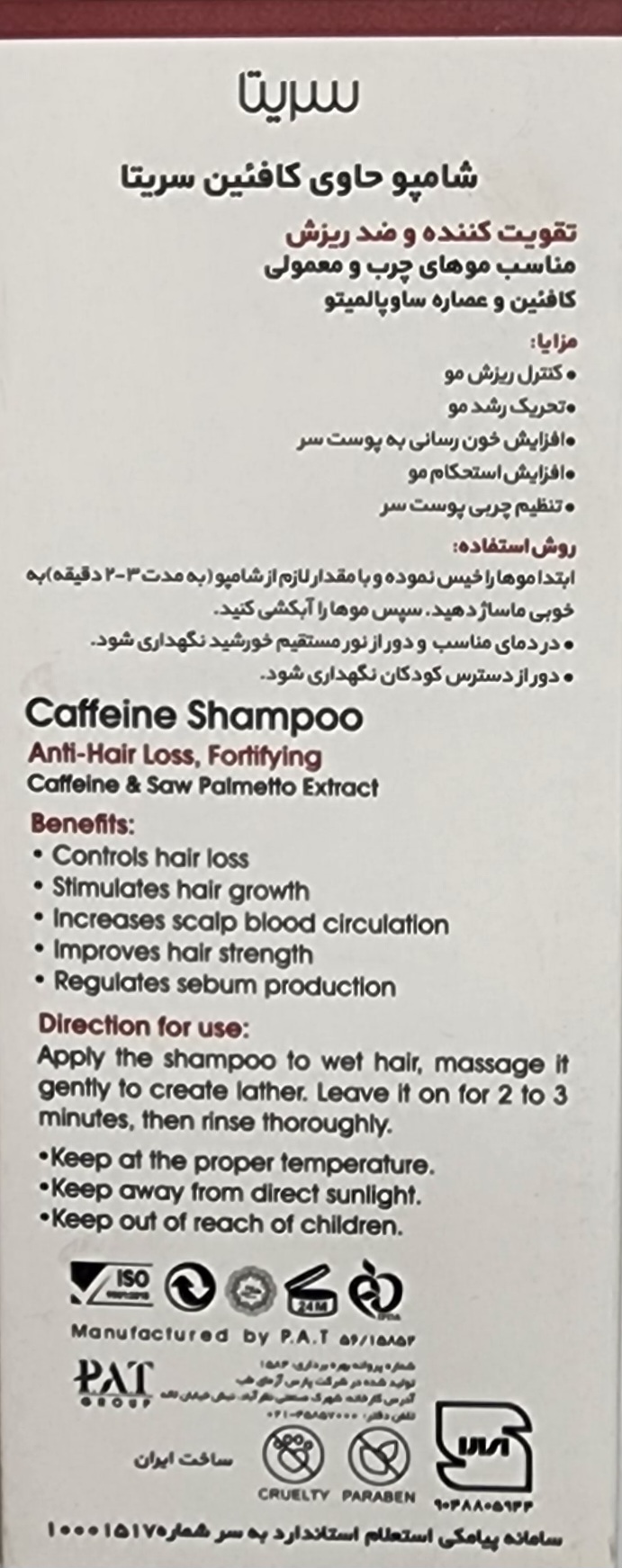 شامپو کافئین سریتا مناسب برای انواع مو است. این محصول حاوی ترکیبات موثر کافئین، ساوپالمیتو، پروتئین جوانه گندم و عصاره های گیاهی است که باعث تقویت مو، کنترل ریزش مو و کمک به رویش و رشد مجدد مو می گردد.