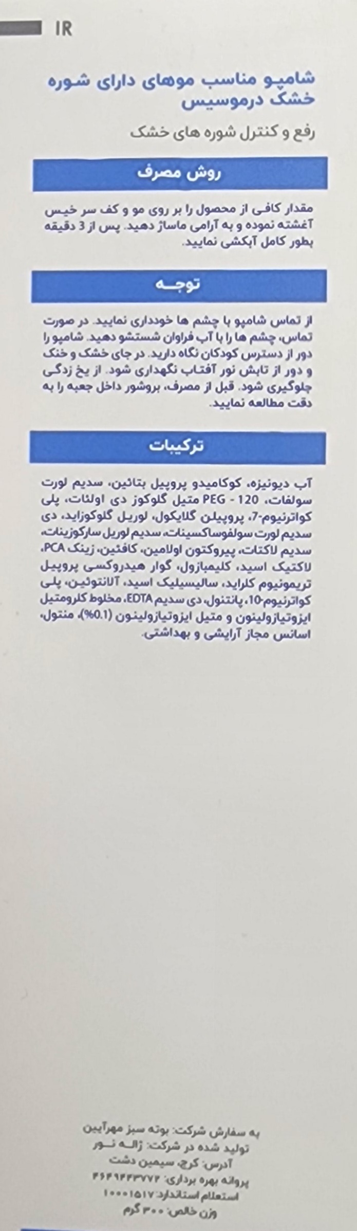 شامپو ضد شوره خشک دندروسیس درموسیس تولید شده در بستهبندی 300 گرمی
