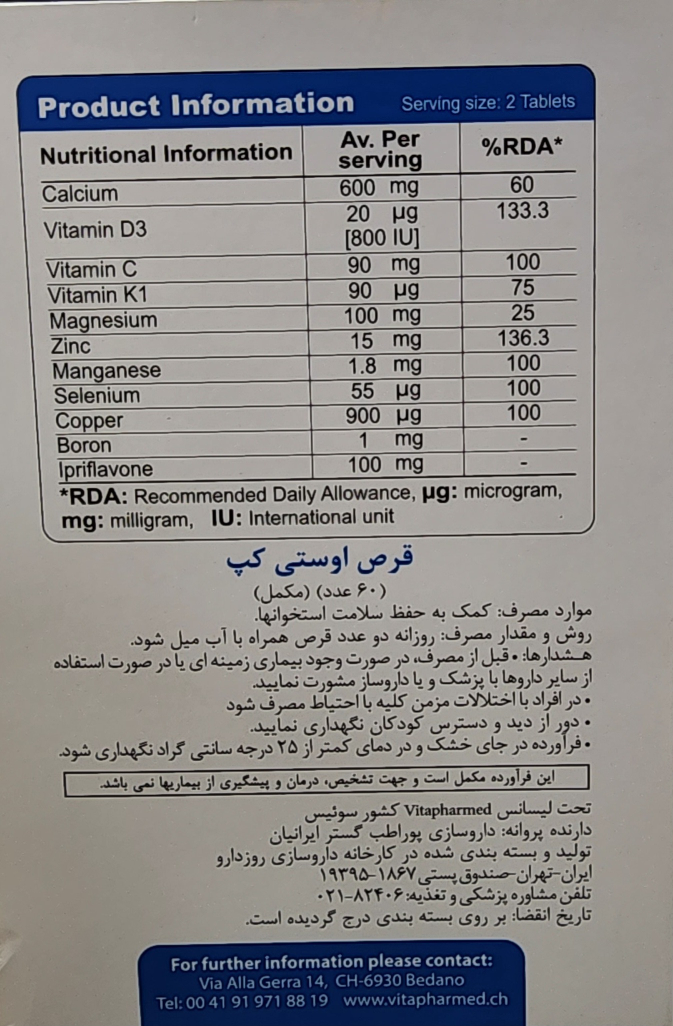 قرص osticap مکمل تغذیه ای تخصصی جهت حفظ سلامت استخوان ها است. فرمولاسیون این مکمل که شامل ویتامین ها و مواد معدنی به همراه ترکیب ویژه ایپریفلاون است، به حفظ تراکم استخوان ها کمک کرده و ریسک ابتلا به پوکی استخوان را کاهش میدهد.دو عدد هر ۱۲ ساعت بعد از غذامصرف شود.