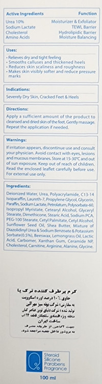 کرم ترمیم کننده قوی یا حاوی 10% اوره اسکوویت، با فرمولاسیون پیشرفته و انحصاری فاقد استروئید، سیلیکون، پارابن ها و اسانس بوده و با دارا بودن عوامل مرطوب کننده طبیعی (NMFs)، سبب رفع خشکی و زبری و پوسته پوسته شدن زانو، قوزک و پوست کف پا، ترمیم ترک ها و بهبود پینه کف پا می باشد. این فرآورده تخصصی با تامین و با حفظ رطوبت پوست کف پا منجر به ترمیم سد دفاعی پوست و افزایش نرمی و لطافت کف پا می شود.