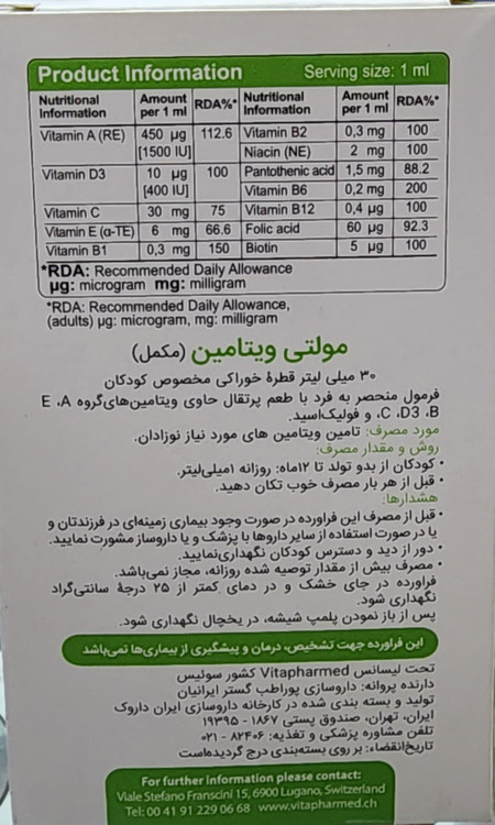 قطره مولتی ویتامین ویوا کیدز یک مکمل غذایی است که برای تأمین ویتامینهای ضروری کودکان و نوزادان تولید شده است. این قطره حاوی ۱۲ ویتامین مختلف است و به رشد و سلامت کودکان کمک میکند.