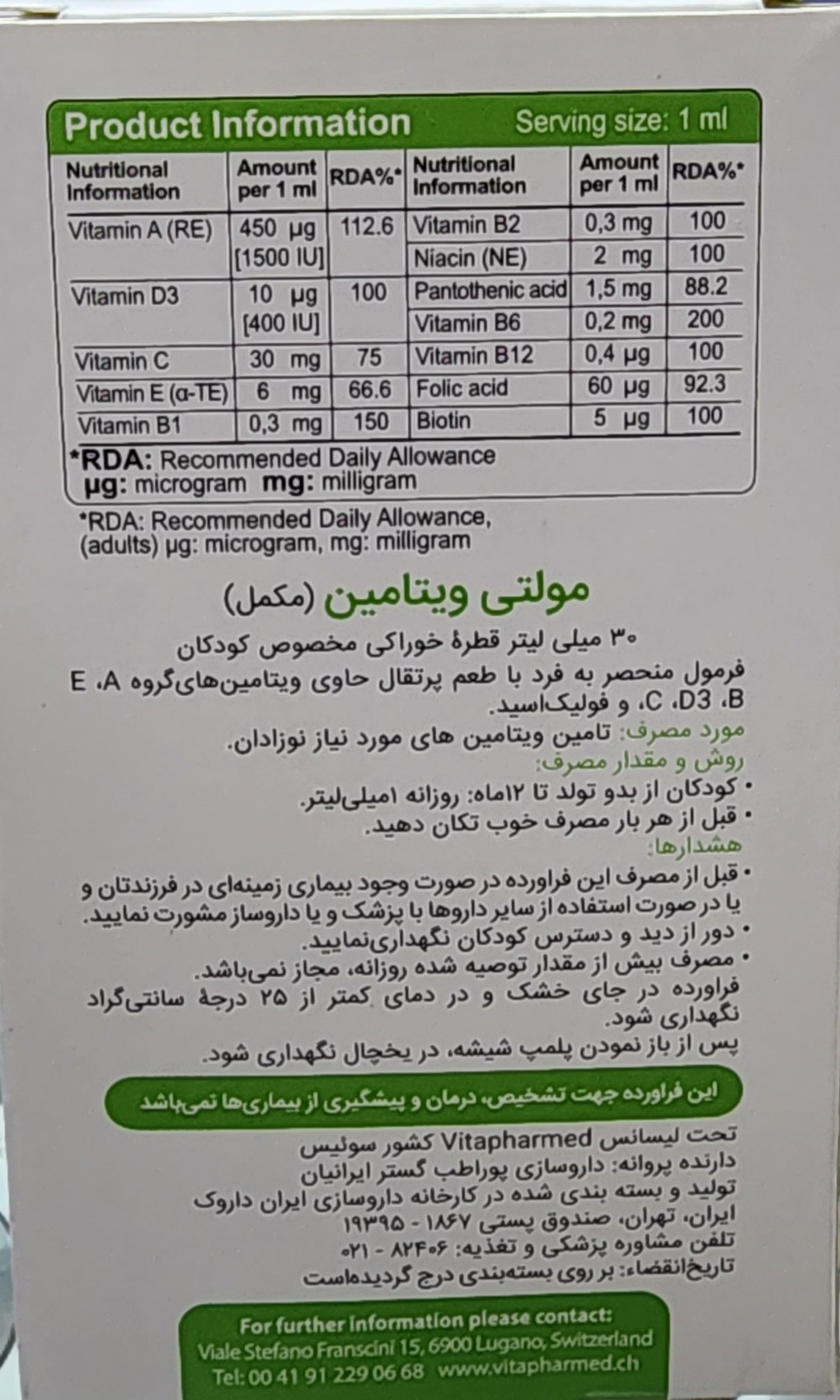قطره مولتی ویتامین ویواکیدز توسط شرکت فارمد سوئیس تولید میشود.