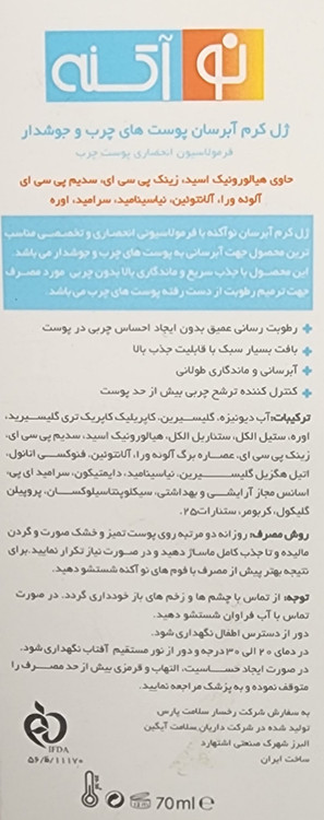آبرسان نو آکنه پوست چرب فرموله شده با مواد موثره هیالورونیک اسید، سرامید و نیاسین آمید