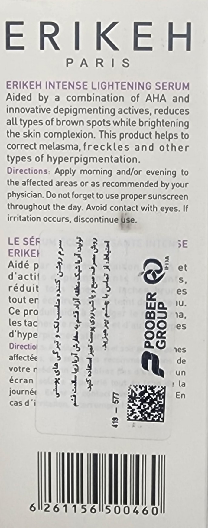 سرم ضد لک قوی از برند اریکه همچنین دارای ترکیبات گیاهی قوی مانند شیرین بیان، شاه توت، نعنا و کوجیک اسید برای کاهش موثر تیرگیهای پوست