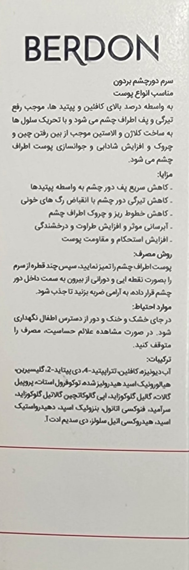 کاهش دهنده پف زیر چشم رفع تیرگی دور چشم مناسب انواع پوست کاهش دهنده خطوط سطحی رطوبت رسان ایجاد خاصیت کشسانی جلوگیری از پیری زودرس بهبود جریان خون مویرگی مناسب انواع پوست تحت لیسانس کشور کانادا