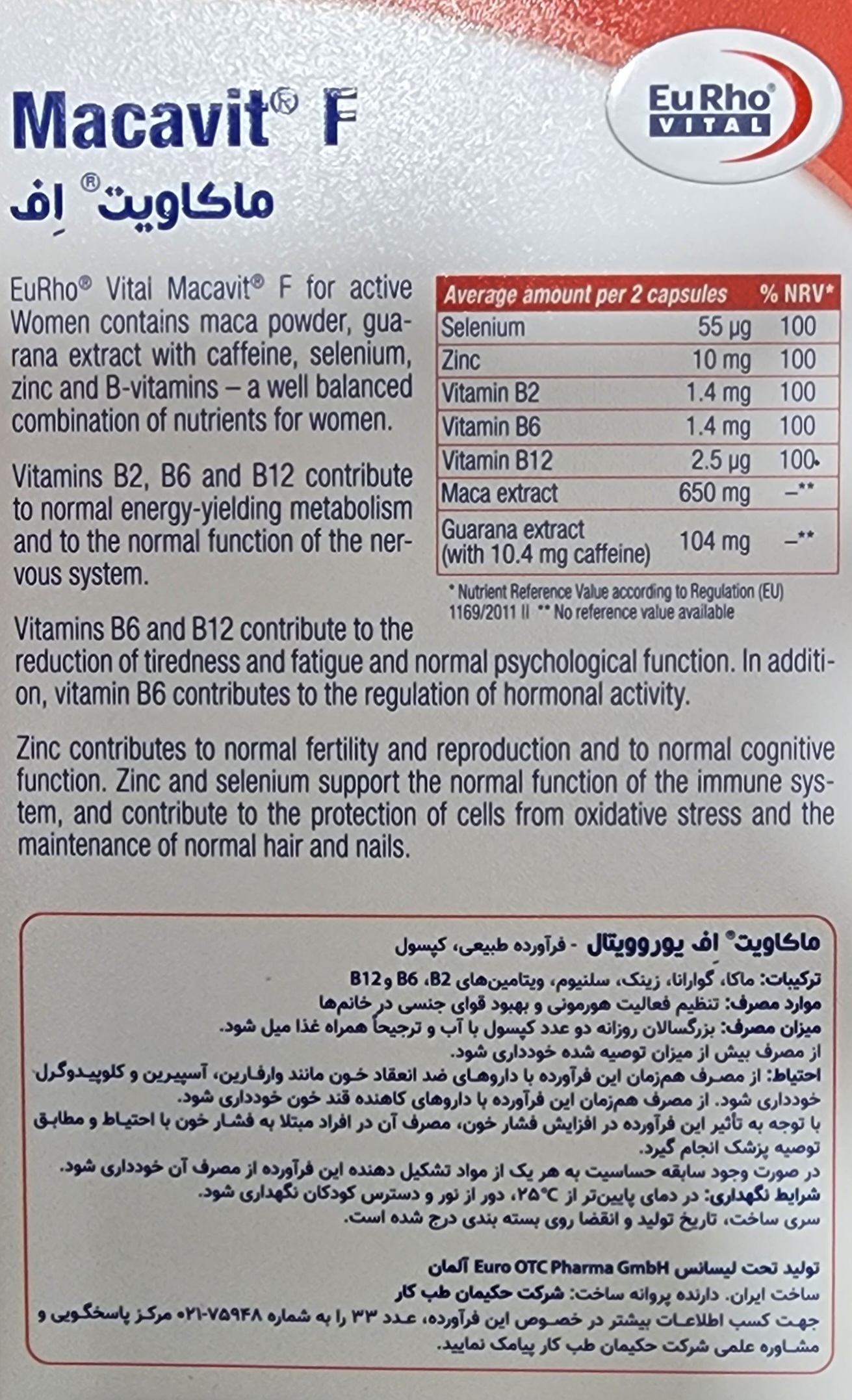 هر جعبه از کپسول Macavit F بانوان مناسب برای استفاده به مدت 30 روز است.