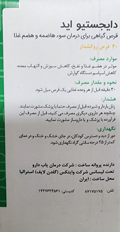 نحوه مصرف دایجستیو اید: نیم ساعت قبل از هر وعده غذایی، 1 قرص میل شود.