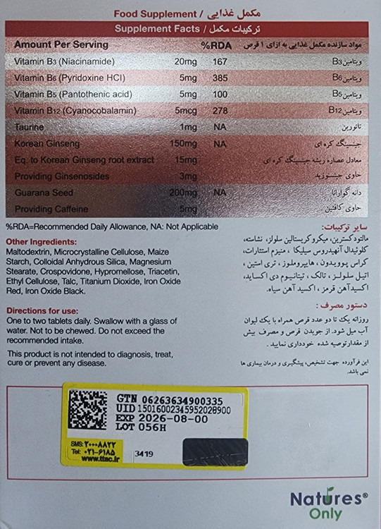 حاوی ترکیبی از ویتامینهای گروه B، تائورین، جینسینگ کرهای و گوارانا