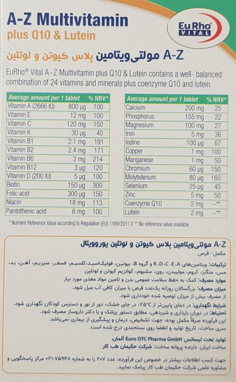 قرص AZ مولتی ویتامین پلاس کیوتن و لوتئین یوروویتال حاوی تمامی ویتامینها و مواد معدنی مورد نیاز است. بدن ما در طول شبانه روز به مقادیر مشخصی از انواع ویتامین و مواد معدنی نیاز دارد. اما در شرایط مختلف و رژیم غذایی متفاوت ممکن است بعضی از این مواد به اندازه مورد نیاز به بدن نرسند. در چنین شرایطی مصرف مولتی ویتامین بسیار حیاتی است. چرا که از جمله دلایل مصرف مولتی ویتامین خارجی در کنار رژیم غذایی مناسب شامل حفظ سلامت عمومی بدن، قلب، استخوان و دندان، سلامت پوست، مو و ناخن و چشم میشود.