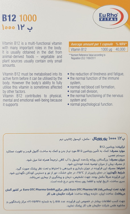 قرص ب 12 یوروویتال تحت لیسانس کمپانی Euro OTC Pharma GmbH آلمان تولید میشود. این محصول به نمایندگی شرکت حکیمان طب کار توسط کارخانه هگمتان داروی غرب ایران بسته بندی و عرضه میگردد. هر جعبه ب12 یورووتال حاوی 60 قرص است که برای مصرف 2 ماه هر فرد کفایت میکند.
