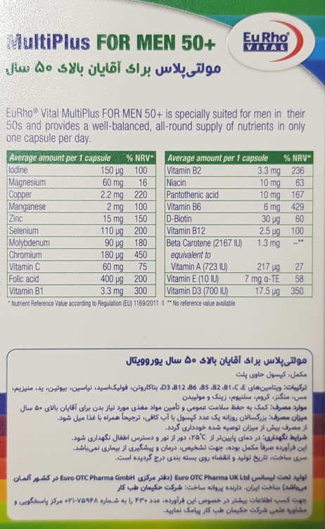 مولتی پلاس بالای 50 سال آقایان یوروویتال، موثر در تامین ریزمغذیها و حفظ سلامت عمومی بدن