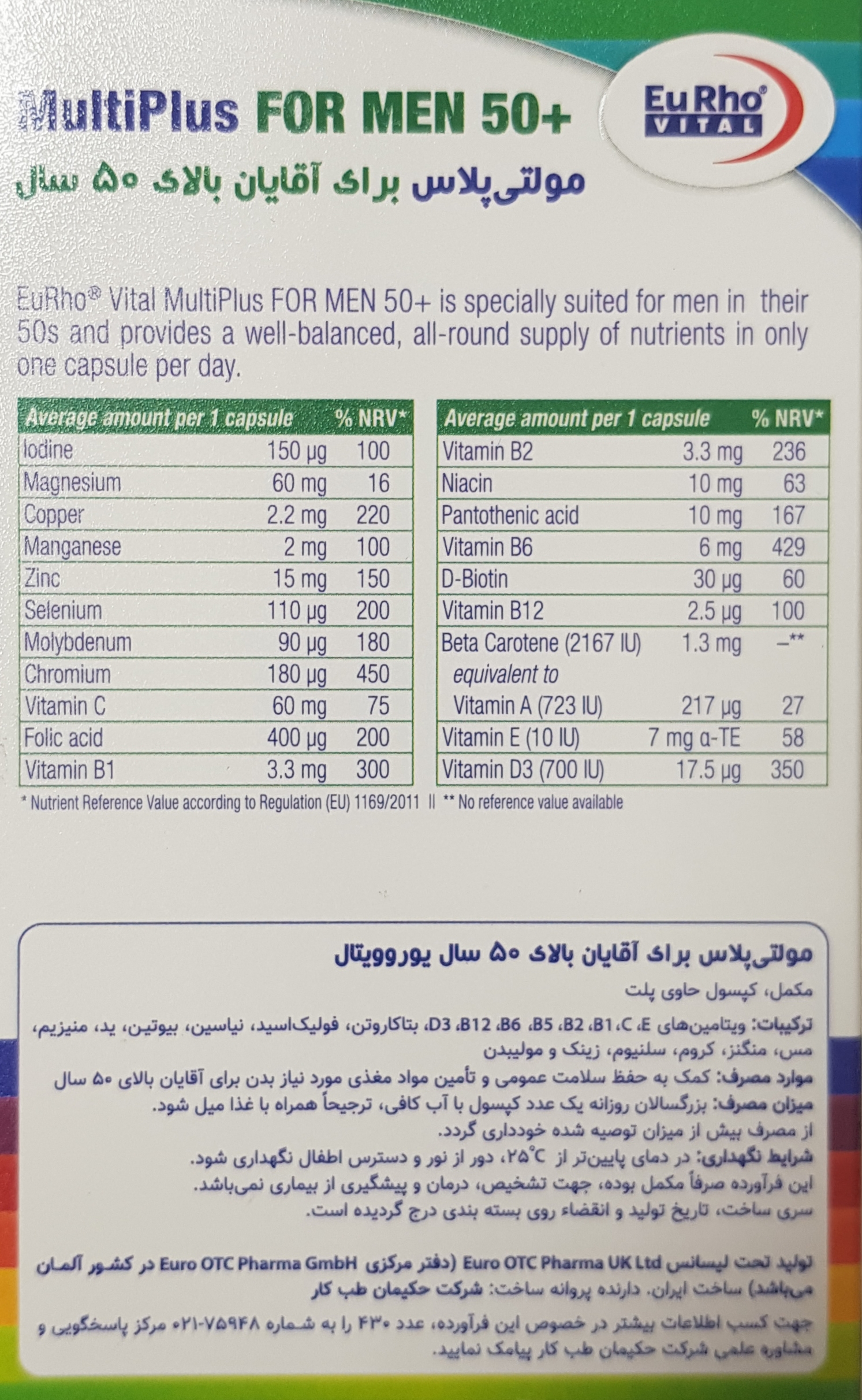 مولتی پلاس بالای 50 سال آقایان کپسول یوروویتال ۶۰عددی ۲۰۲۷/۰۵