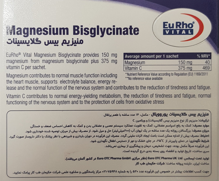 منیزیم بیس گلیسینات یوروویتال حاوی 150 میلی گرم منیزیم در هر ساشه