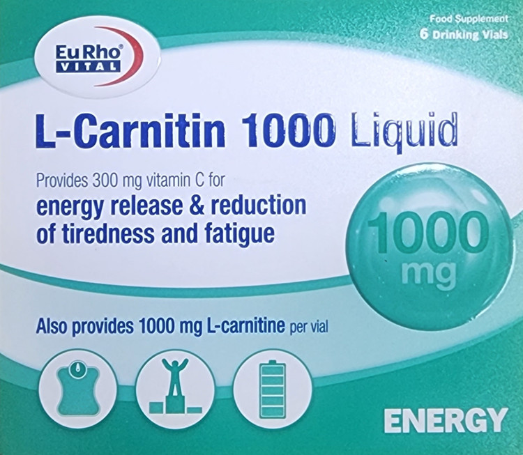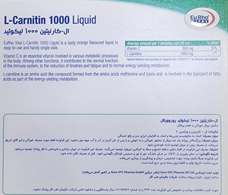 ویال ال کارنیتین 1000 یوروویتال، حاوی ال کارنیتین به همراه ویتامین C