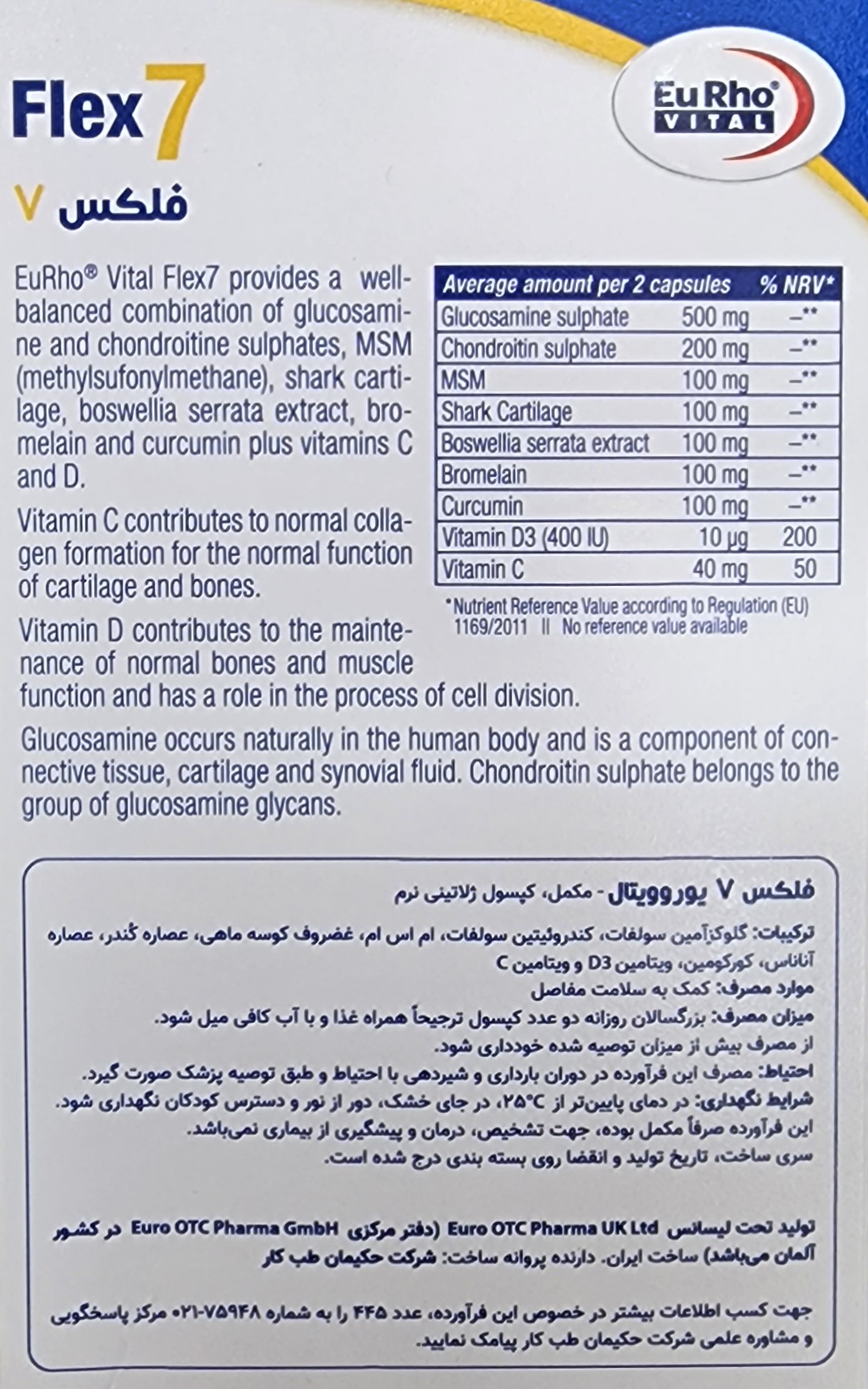 فلکس ۷ حاوی گلوکزآمین سولفات، کندروئیتین سولفات، MSM، عصاره کندر، کورکومین، غضروف کوسه ماهی، بروملین و ویتامینهای C و D