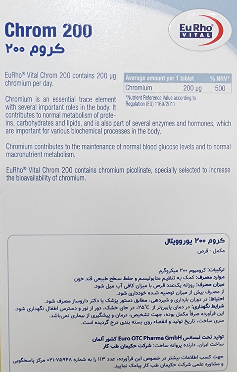 کروم 200 میکروگرم قرص ۶۰عددی یوروویتال ۲۰۲۷/۰۲