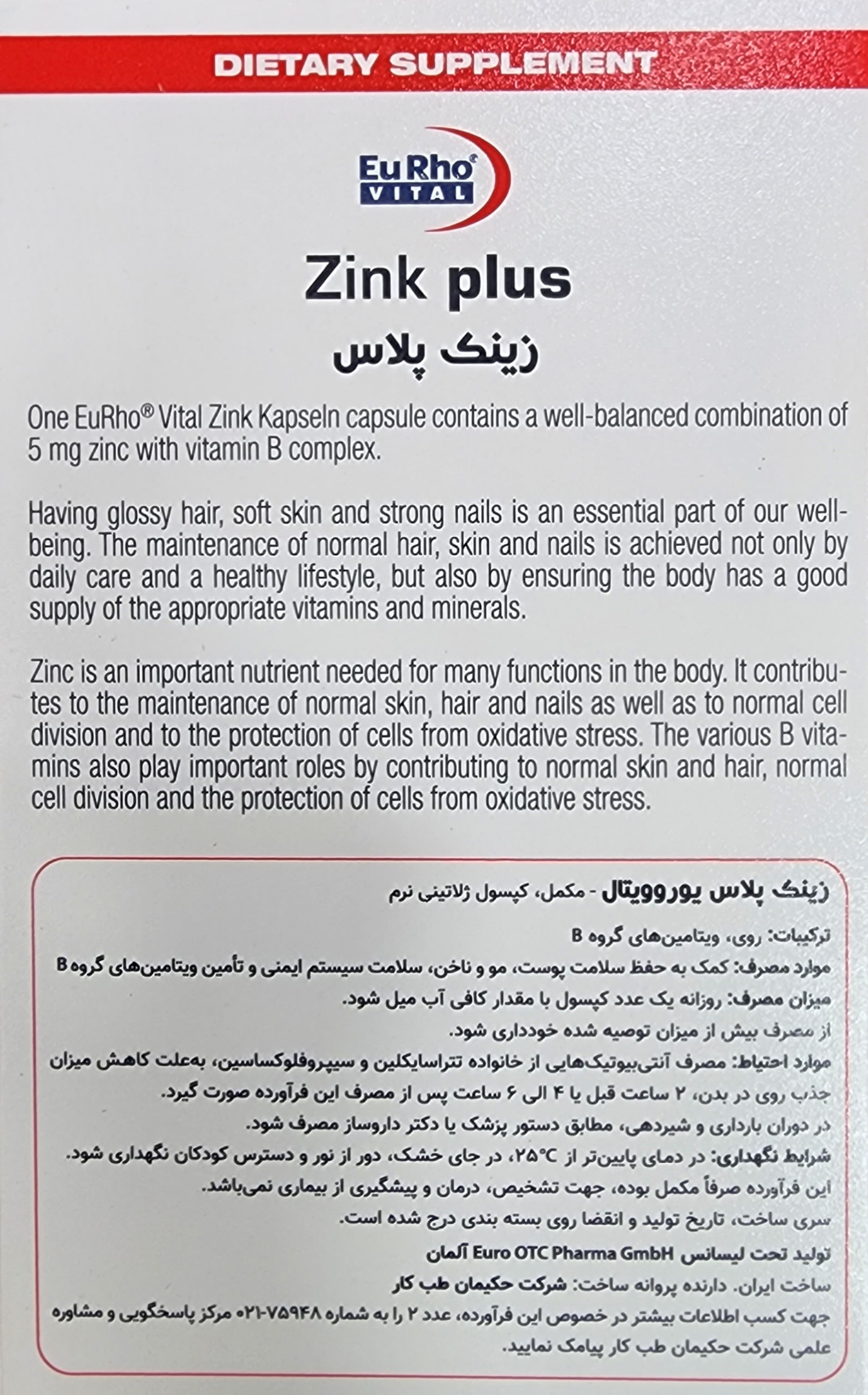 حاوی 5 میلی گرم ماده معدنی زینک دارای ویتامین B1 ،B2 ،B6 ،B،12 ،C جلوگیری و درمان از ریزش مو تقویت کننده سیستم ایمنی فرم گرفتن و استحکام ناخن کمک به سلامت پوست