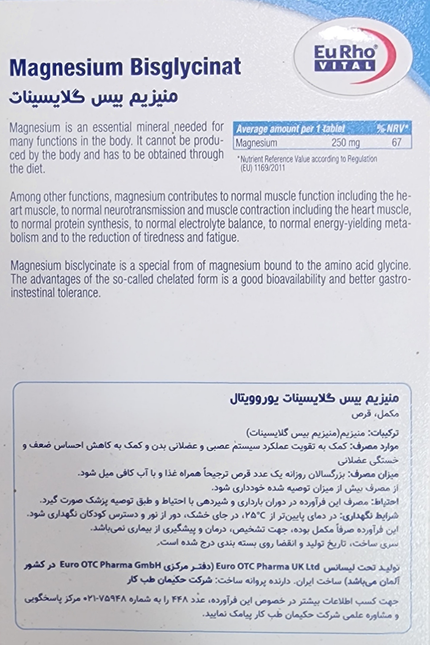 منیزیم بیس گلیسینات یوروویتال، دارای 250 میلی گرم منیزیم المنتال در هر قرص