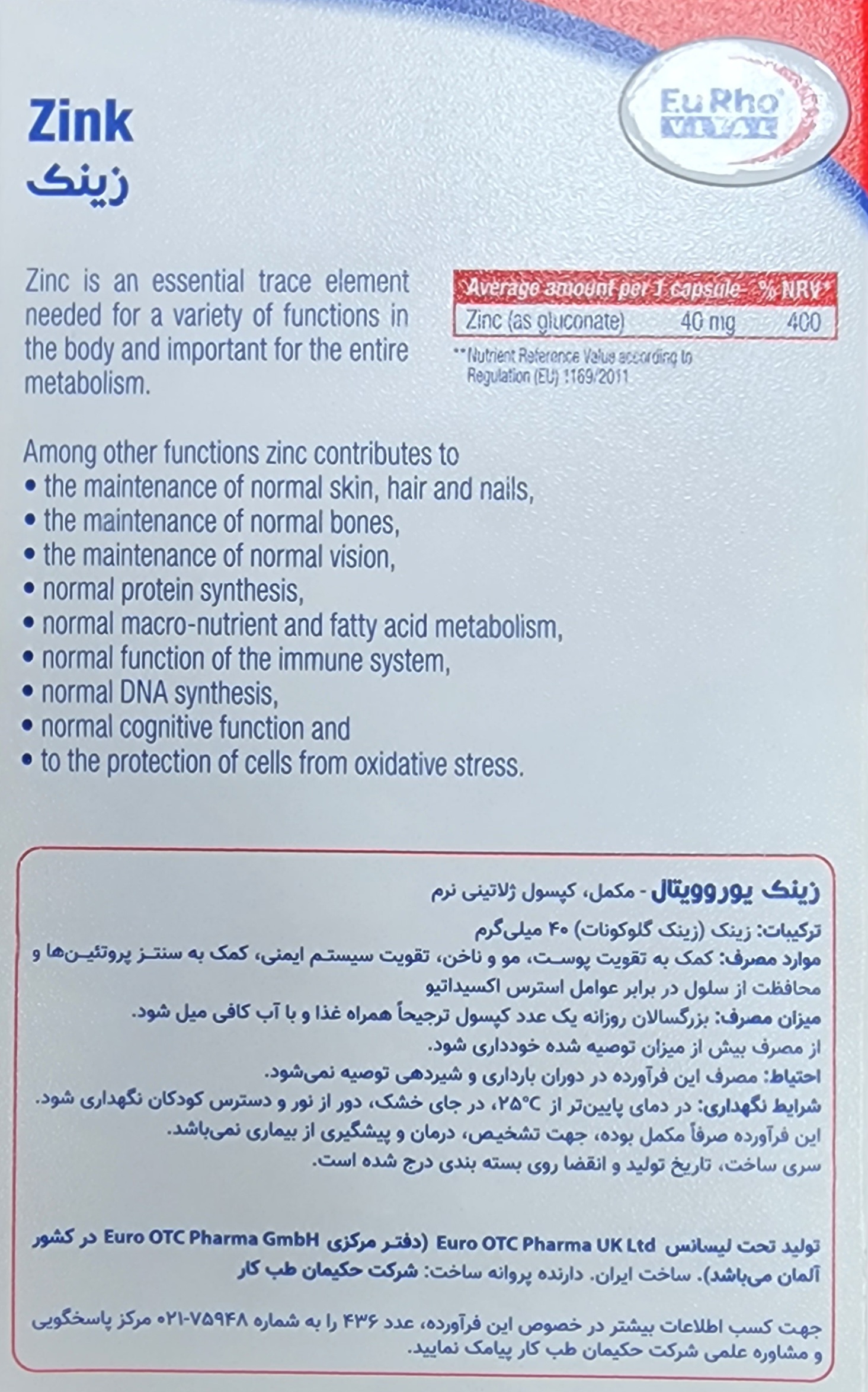 کپسول زینک 40 میلی گرم یوروویتال، تقویت کننده سیستم ایمنی بدن قرص تقویت کننده پوست مو و ناخن حاوی 40 میلی گرم زینک گلوکونات افزایش سنتز پروتئین تسریع ترمیم زخم ها تقویت بینایی چشم