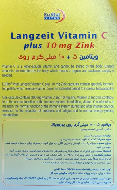 ویتامین سی و زینک کپسول 10 میلی گرم یوروویتال ۶۰عددی۲۰۲۷/۰۲