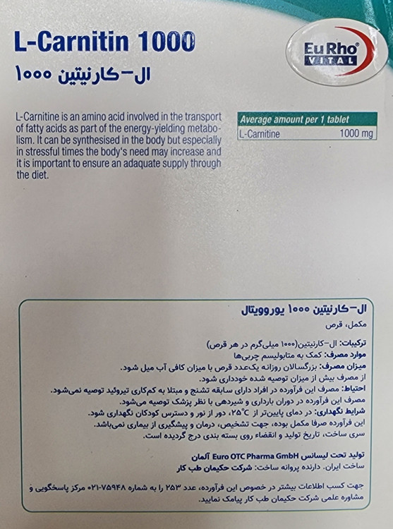 ال کارنیتین یوروویتال 1000 میلی گرمی قرص ۶۰عددی۲۰۲۶/۰۹