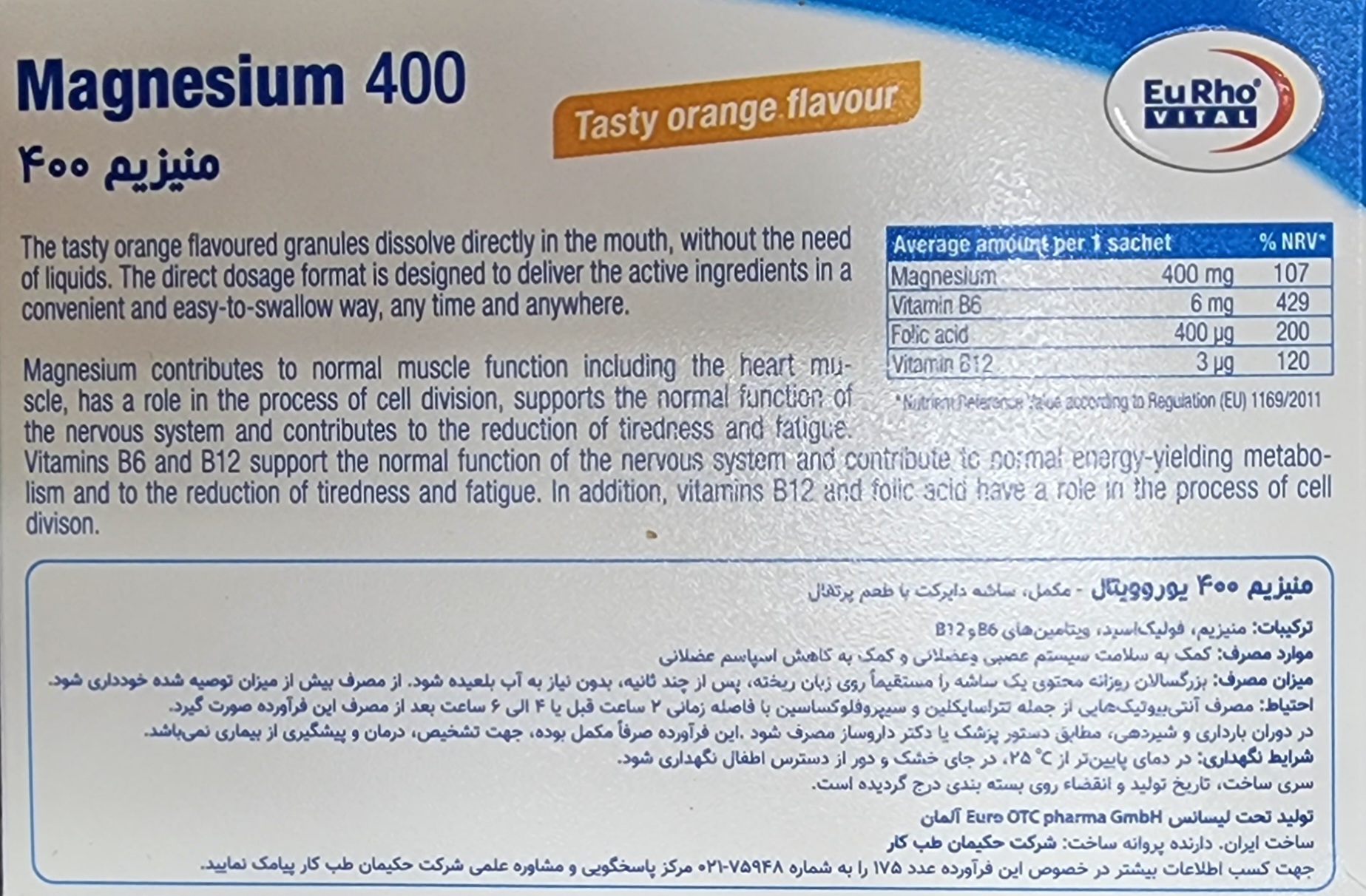 هر جعبه منیزیم 400 یوروویتال مناسب استفاده به مدت 30 روز می باشد.