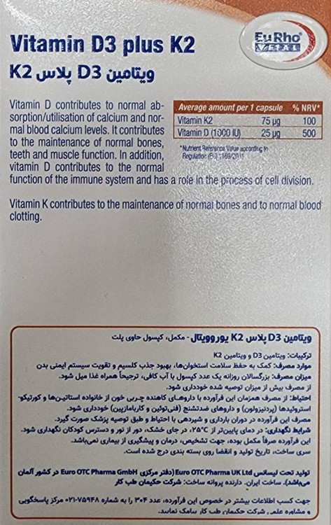 ویتامین د3 پلاس کا2 کپسول۶۰عددی یوروویتال ۲۰۲۷/۰۶