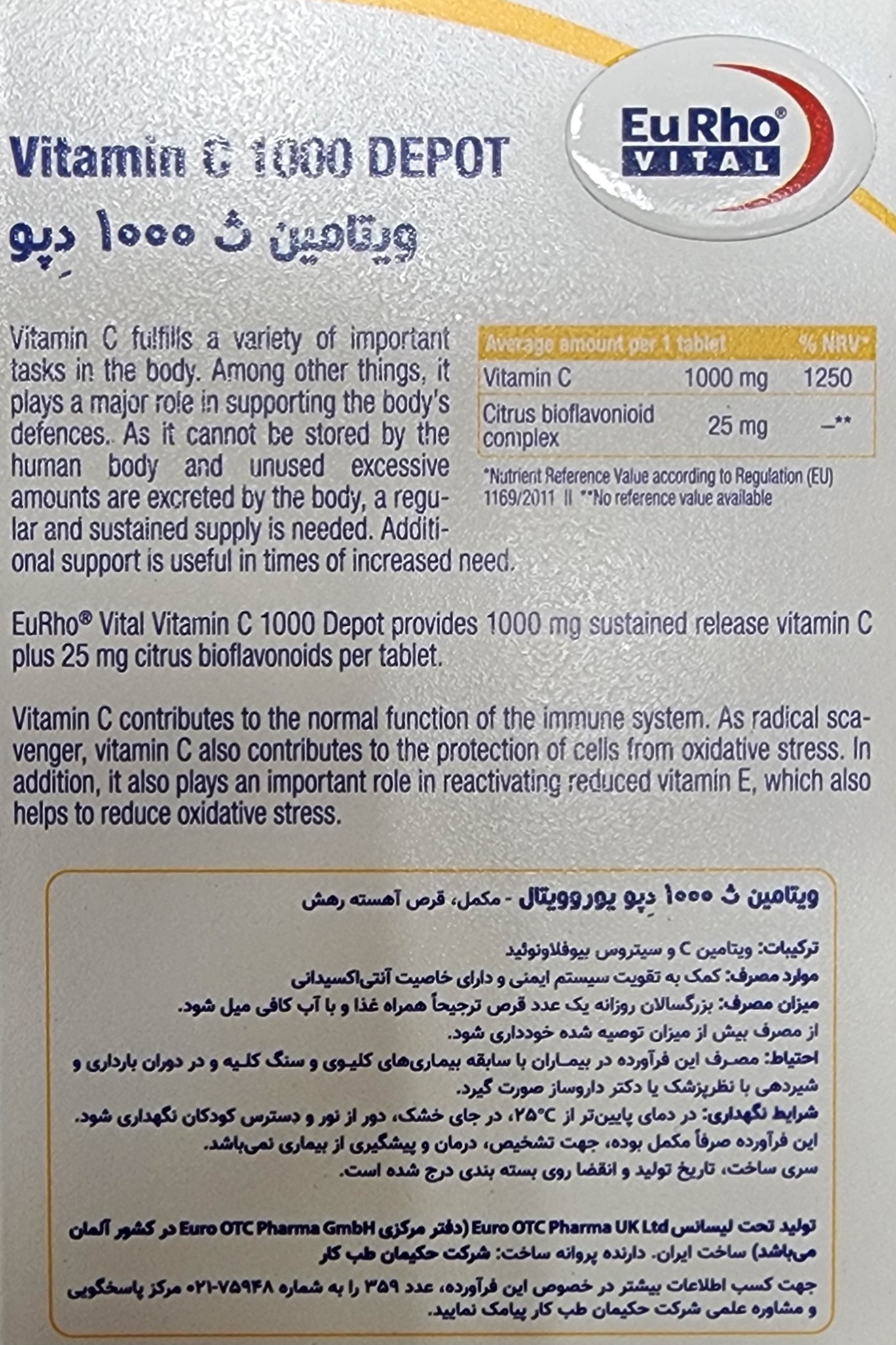 ویتامین ث دپو یوروویتال، حاوی ۱۰۰۰ میلیگرم ویتامین C در کنار بیوفلاونوئید مرکبات