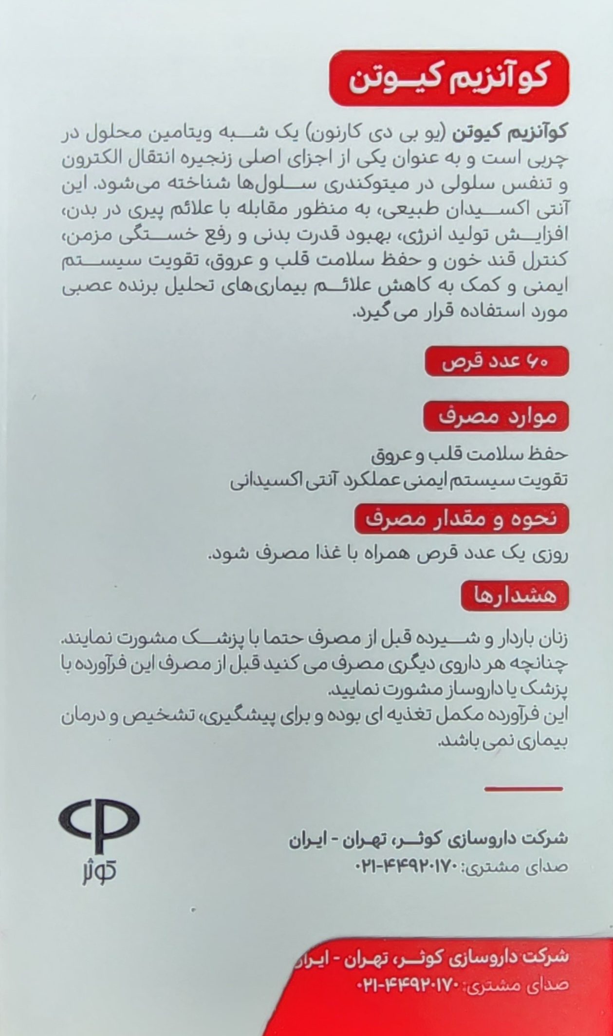 قرص کوآنزیم کیوتن ، حاوی کوآنزیم کیوتن (Q10)، ال کارنیتین به فرم ال کارنیتین تارترات، ویتامین E و عصاره گیاه جینکوبیلوبا