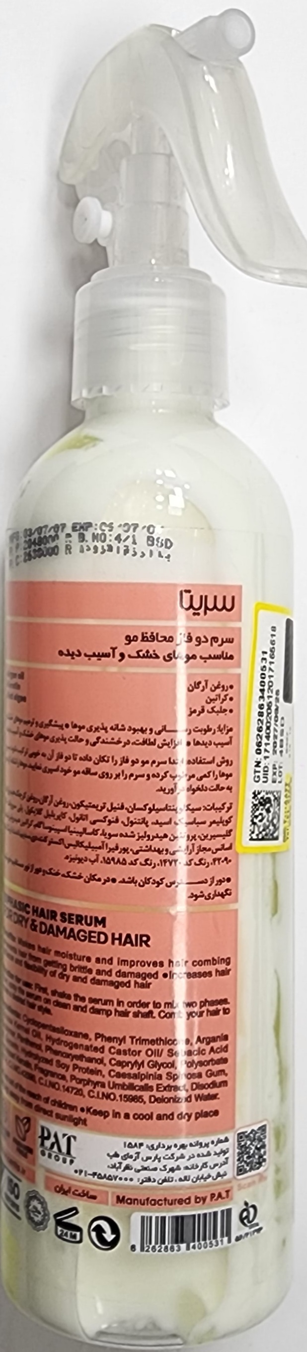 سرم دو فاز موهای خشک و آسیب دیده سریتا، فاقد ترکیبات مضر و پارابن