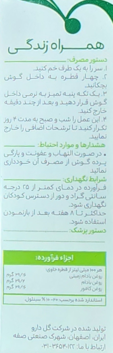 قطره گوش ایرگل، حاوی روغن های گیاهی بادام شیرین، بادام زمینی و کافور